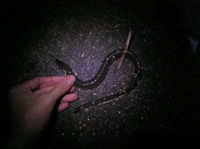 2005-09-23 飼育開始 ウナギ標本 ペットサイズウナギを無事釣り上げた。うひょひょ。 そんな訳で、某ホームセンターでよいこのウナギ飼育セットを購入。 早速小ウナギさんにお住まいいただく。 ウナギさんの寝床はペットボトルにしてみた。 流木の代わりに入れた木炭は水にプカプカ浮いている。 このウナギさん、下唇にかかった釣り針のせいで、ウナギなのにマスオさんの同僚、アナゴさんみたいな唇になってしまっている。ごめん。とりあえず傷が悪化しないように抗菌剤(目薬)でも入れておくか。 明日、お詫びの印に石ころでも拾ってこようかな。